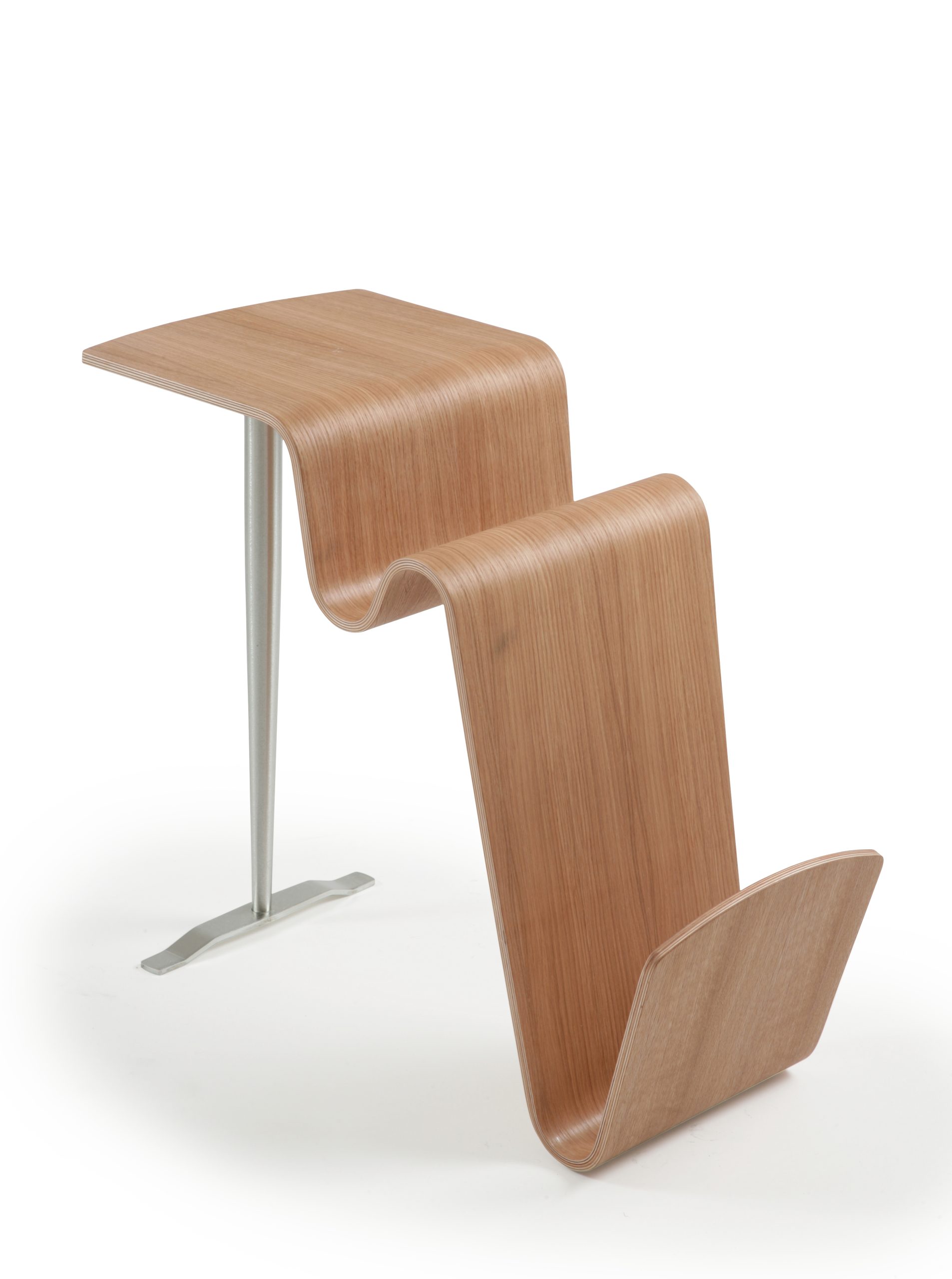 Description: A beautiful, contemporary veneered oak side table designed for multiple uses: small side table, magazine/ newspaper rack, book/ remote holder. This wave design fits in perfectly with boats of all sizes and can be places next to chairs or featured in a small space. They are easy to move, with a brushed zinkcoated leg supporting the table.
