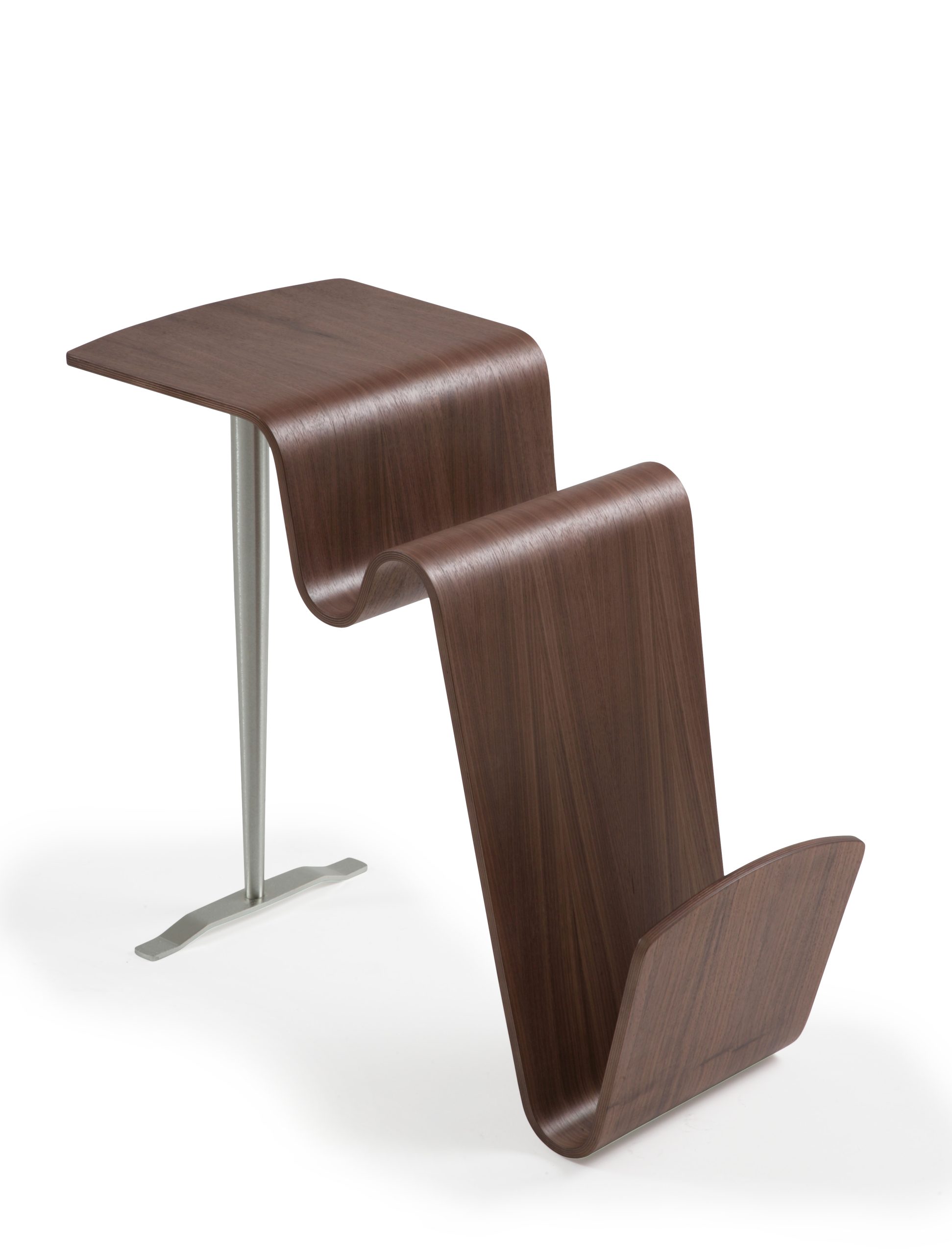Description: A beautiful, contemporary veneered walnut side table designed for multiple uses: small side table, magazine/ newspaper rack, book/ remote holder. This wave design fits in perfectly with boats of all sizes and can be places next to chairs or featured in a small space. They are easy to move, with a brushed zinkcoated leg supporting the table.