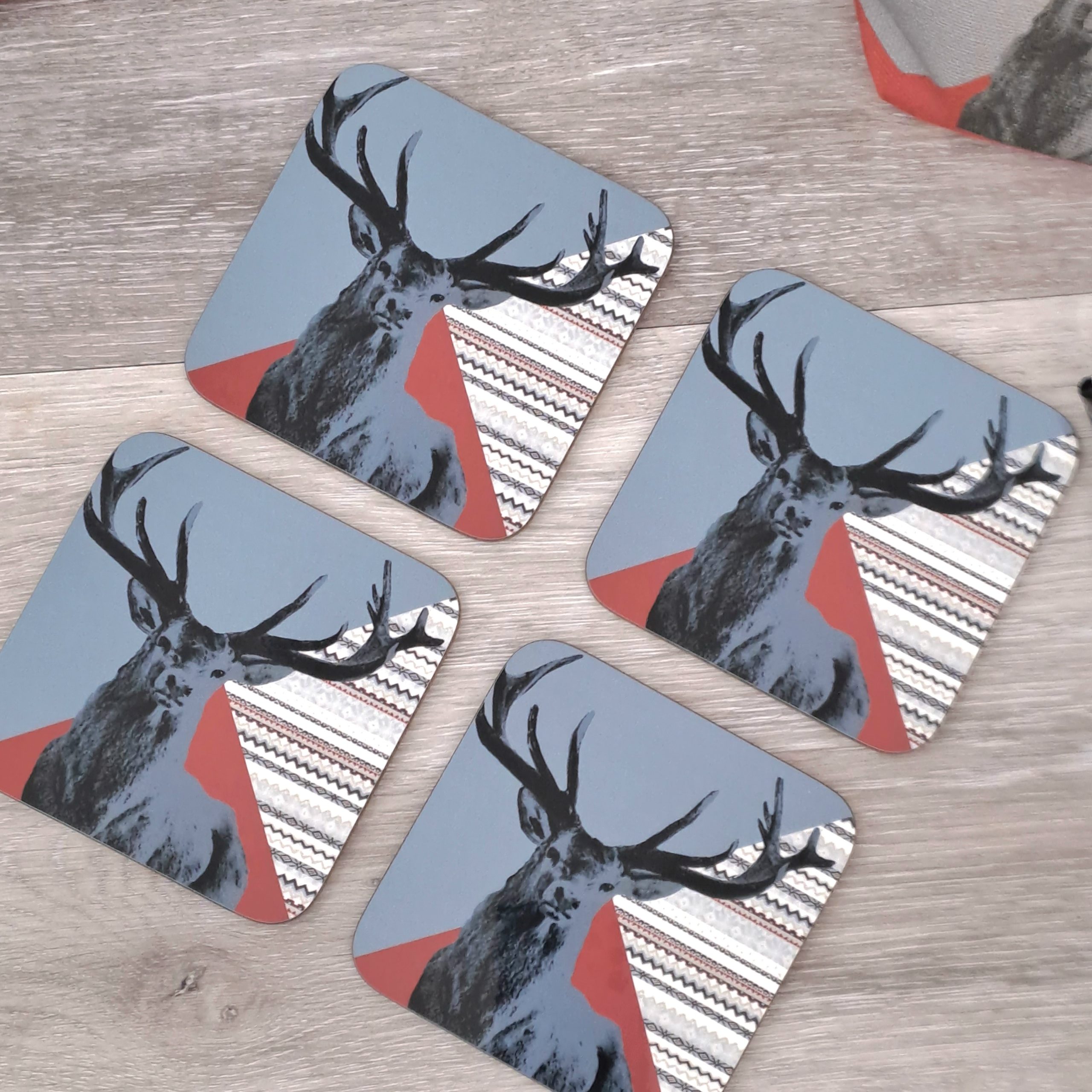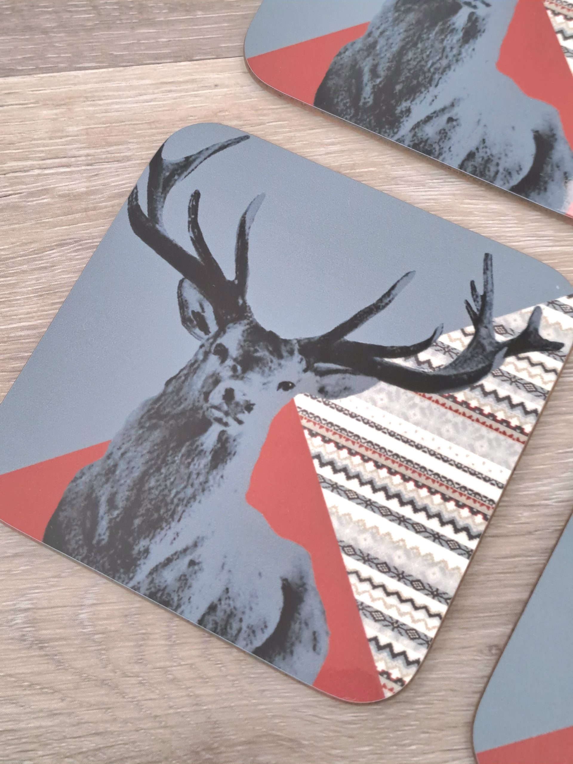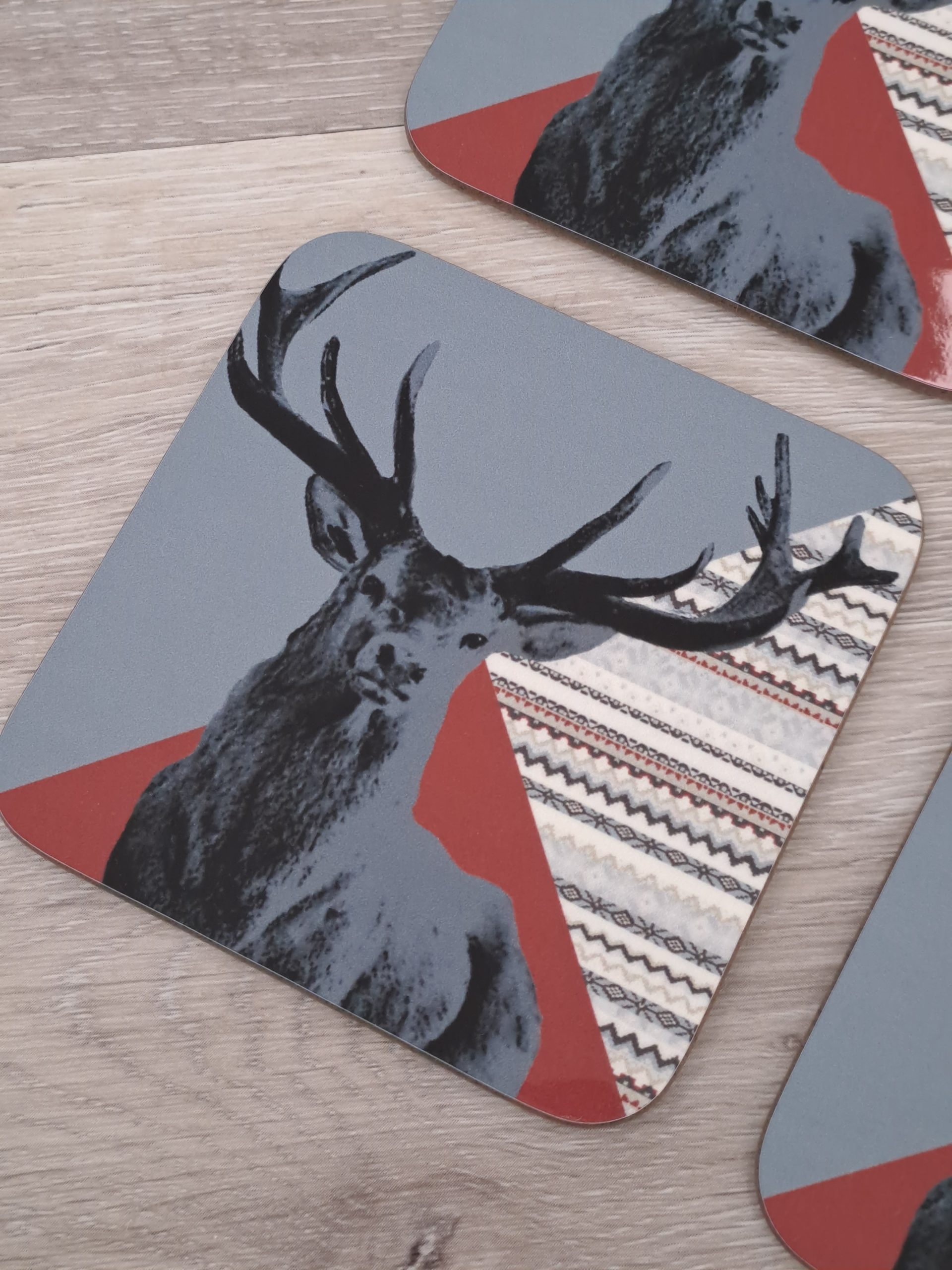 Gorgeous Red Stag coasters, that match with Highland Loch Teal placemats. Vibrant in colour due to the glossy finish, and easy to wipe clean.