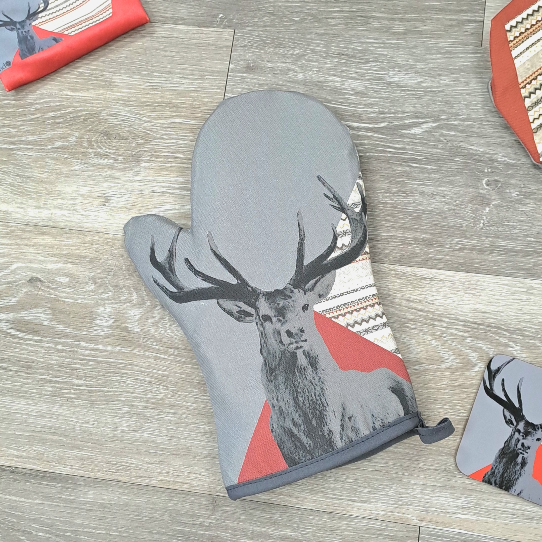 Red Stag Oven Mitt design is inspired by the Highland Lochs. Designed with a stunning stag on each side of this single gauntlet. Sustainably made with organic cotton.