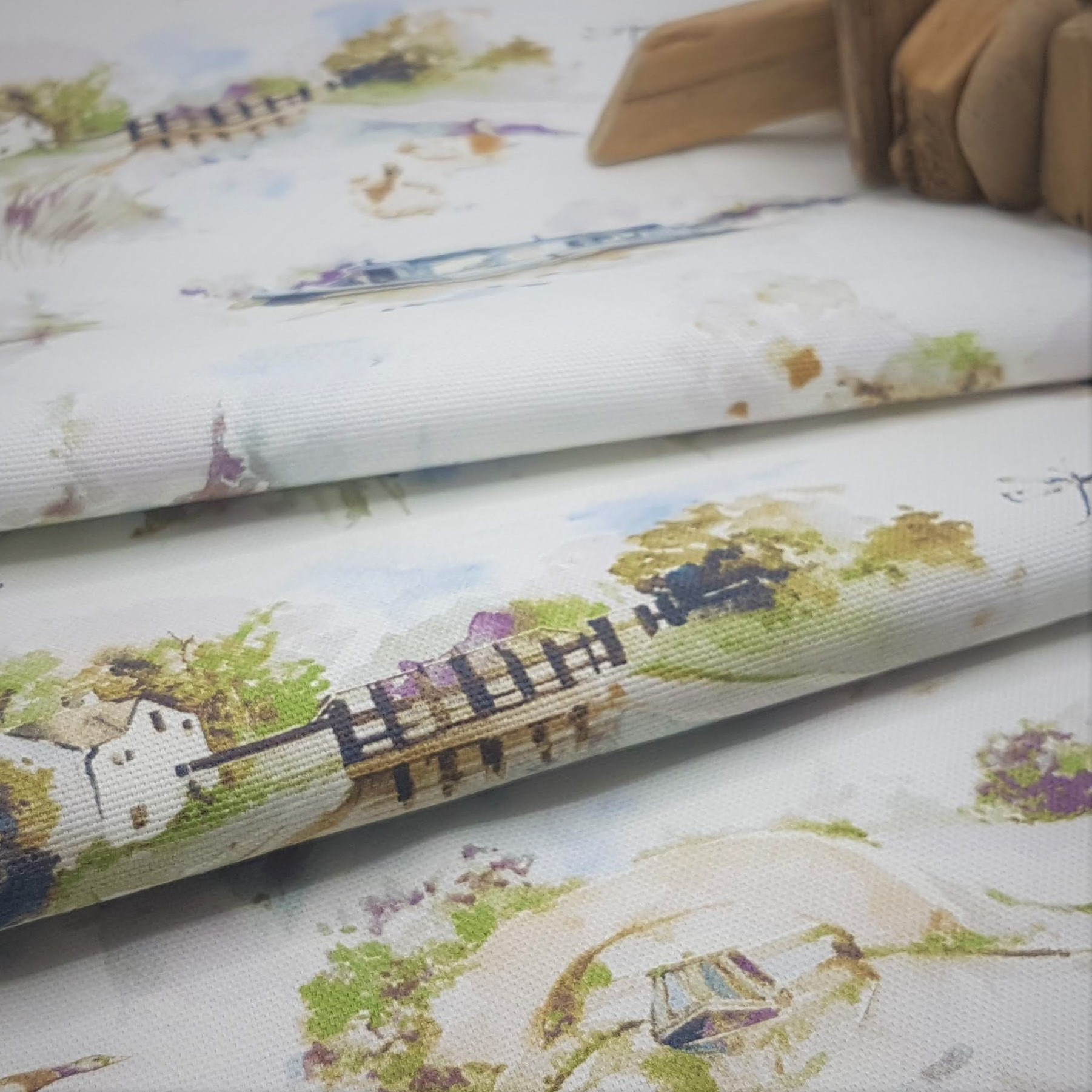 Product: Spring Canal Scene Door Panel & Bonded Blackout back fabric. Rectangular or square cushion to fit your door window, additional options include a small tab top and bottom, or a tab in each corner, with press stud to secure to the door.